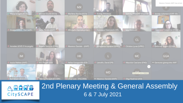 The 2nd CitySCAPE plenary meeting and the CitySCAPE General Assembly were held on 6 and 7 July 2021, virtually due to the restrictions of COVID 19. During the first day, there were interesting discussions between the partners on their future plans regarding the project as well as presentations on the current status and the progress that has been performed in each work package. The second day was dedicated to three technical workshops: The ‘CitySCAPE toolkit lifecycle regarding use cases and attack scenarios’ led by our partner UPRC, the ‘Fallback solutions so that CPaaS can provide useful data’ led by ACS and the ‘UI demos’ with the contribution of ACS, ED, STAM, UPRC and ENG.